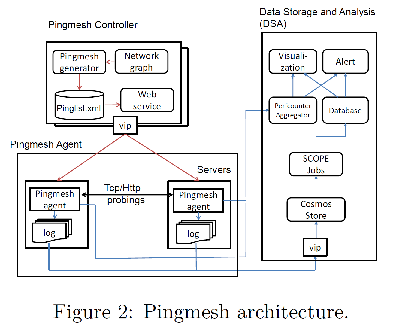 Pingmesh 由微软提出,已经在微软 DCN 内大规模部署(AliPing 也使用了该方案)。Pingmesh 使主机主动发起并回复 Ping 请求,通过监测 Ping 请求的完成时间对 DCN 间链路进行测量。同时,Pingmesh 能够作为一个背景服务保持长期上线,因此能够无间断地,甚至在服务上线之前收集并分析网络数据。
