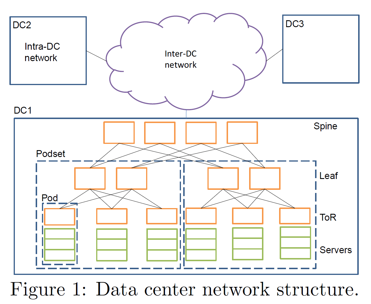 Pingmesh 将 DCN 的拓扑抽象为三个层级:主机、机架、机房;Pingmesh 希望能够做到链路的 100% 检测覆盖率(主机间完全图覆盖),即:任意两个主机之间的链路都至少被检测一次。但考虑到 DCN 拓扑,同一个机架内的两台机器对外发送请求时,会使用同一个 ToR 交换机;同一个机房内的两台机器对外发送请求时,也会使用同一个机房交换机;这些节点资源是向下复用的,因此没有必要实现任意两主机之间的完全图覆盖,而仅需要保证:机架内主机的完全图覆盖、机房内机架的完全图覆盖、机房间机房的完全图覆盖即可。机器具体的 Ping 列表生成根据各个机房结构不同,算法差异较大。