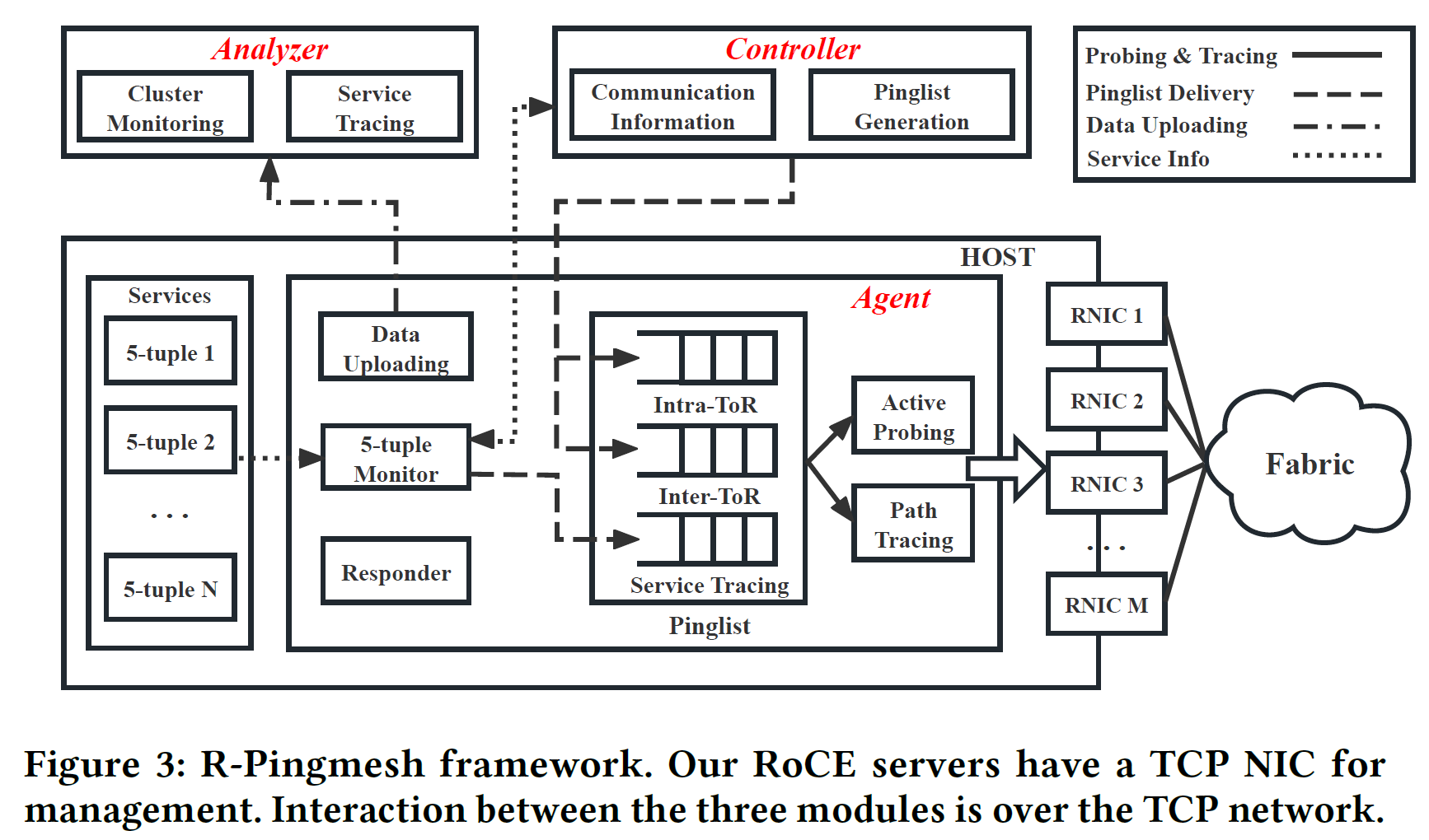 R-Pingmesh 的架构设计与 Pingmesh 大体相似;但由于 RoCE 不存在跨机房流量,因此只需要检测机架内和机架间的流量即可(R-Pingmesh 将该模块称为 Cluster Monitoring)。在此之外,R-Pingmesh 通过针对实际 RMDA 连接的五元组构造 Ping 请求的方式,为实际的流提供了 SLA 的实时监测(该模块称为 Service Tracing)。