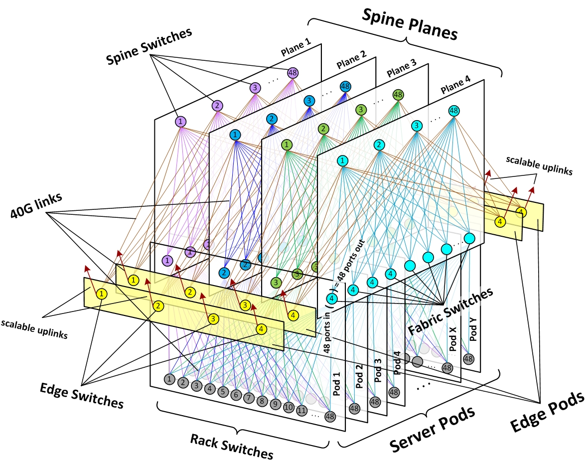最下面灰色的是 ToR,每 48 个 ToR 构成一个 Pod。一个 Pod 内有 4 个 Agg Switch,每个 Agg 向下与每个 ToR 连接,向上与 Plane 内 Core Switch 连接。在同一个 Pod 内的两个 Agg 由于不属于同一个 Plane,因此不会连到同一个 Core。所以只要定位走了哪个 Core(和主机 ID),就能还原出整条链路。