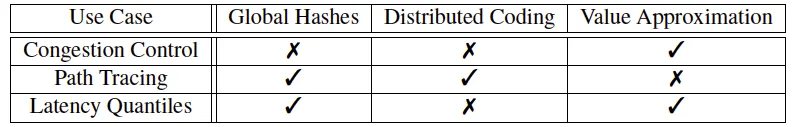 - Static Per-Flow:让 Switch 用分布式编码保存数据,终端进行聚合。适用于流粒度的检测,如路径追踪。