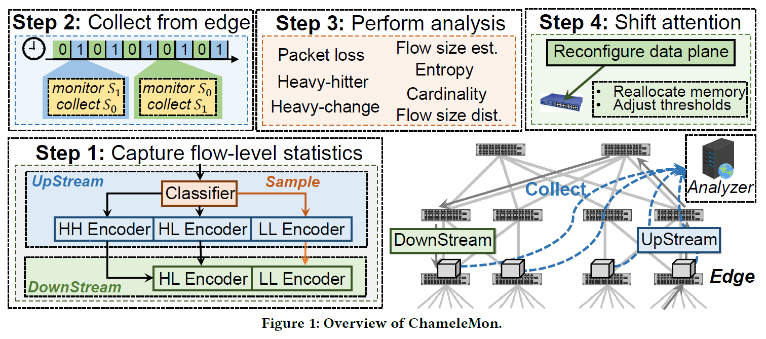 ChameleMon 想解决的问题是:在有限的计算和存储资源下,既要支持 packet accumulation task(流量统计、大象流筛选等,主要使用各种 Sketch 来做),又要支持 packet loss tasks(丢包检测,主要使用 IBLT 和各种可编程交换机特性来做),还不想像 FlowRadar 那样维护所有流信息。为此,ChameleMon 将所有流分为三类:HH(Heavy-Hitter)、HL(Heavy-Loss)、LL(Light-Loss)。