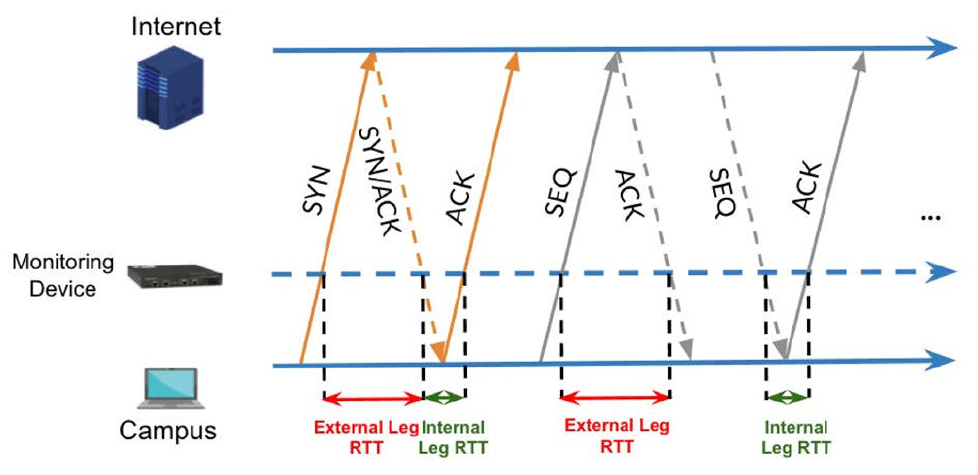 出于对 RTT 进行高精度连续实时监测的需要,DART 实现了一套基于 Tofino P4 的 RTT 实时检测系统。实现的基本思想仍然基于 TCP 的流控,通过观察上下行的 SeqNo 和 AckNo 对 timestamp 进行匹配,从而计算得到 RTT。由于测量设备位于 Host 和 User 的中间位置,因此需要双向的流监控才能得到完整的 RTT 信息。