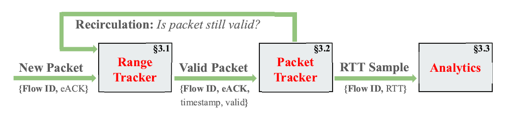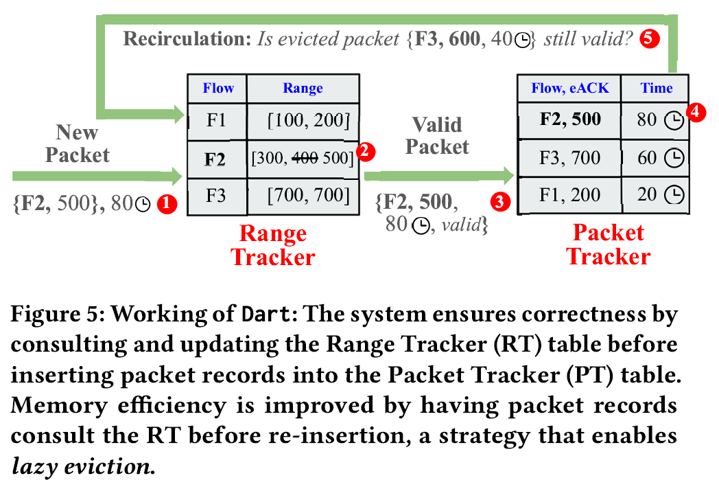 虽然 DART 在维护一个类似于 TCP 的滑动窗口,但其核心目标是进行 RTT 查询,而不是空洞的维护;因此,类似累计 ACK 的机制反而会影响 DART 计算出正确的 RTT。为了降低计算和存储压力,DART 设计了一个两步的流程:Range Tracker 维护每个活跃流(四元组)的有效序列号范围,将不可能计算出正确 RTT 的 ACK 和 SEQ 全部过滤掉;Packet Tracker 维护一个 SEQ 表,记录可能得到正确 RTT 的 SEQ-timestamp 对,直到一个对应的 ACK 到达用于计算出 RTT 并将对应的 SEQ 项从表中删去。
