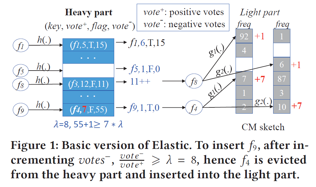 ElasticSketch 想解决:在同一个网络测量域内,Elephant Flow 和 Mice Flow 很难同时精确测量的问题。ElasticSketch 设计了一个两级结构:前端的 Heavy Part 是一个 Hashtable,记录 Elephant Flow;后端的 Light Part 是一个 CMS,记录 Mice Flow。在 Hashtable 里,每个桶维护四个值:flowKey、vote+(映射到该桶中 ID 为 flowKey 的次数)、vote-(映射到该桶中 ID 不为 flowKey 的次数)、flag(该 flowKey 是否有一部分记录值在 CMS 中)。