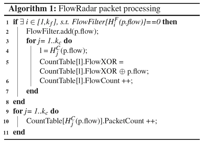FlowRadar 直接使用了一个 IBLT 存储流(即:前端一个 Bloom Filter,后端一个 BLT),采用 XOR 模式;解码方式也与 IBLT 相同。