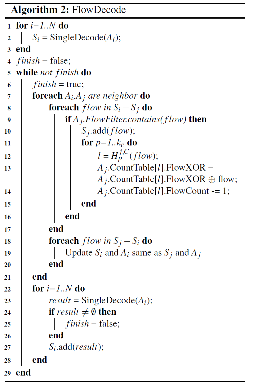 在此基础上,FlowRadar 提出了 Network-wide Decoding 来提高解码成功率。FlowRadar 认为,相邻两个交换机的流有很大程度上的重合;因此在迭代解码过程中,每经过一次迭代,就把当次解码新得到的结果应用在邻居 Switch 上,尝试在邻居 Switch 的 IBLT 中减去该值。