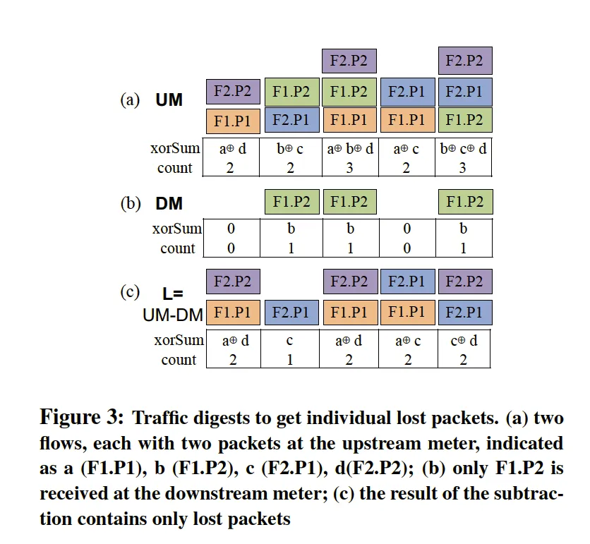 和 FlowRadar 类似,LossRadar 也使用 IBLT。考虑到需要以逐包的粒度测量丢包,LossRadar 在每个交换机的入口和出口处(所有节点处)布置一张采用 XOR 规则的 IBLT。具体而言,当数据包 $X$ 到达时,将对应 IBLT 的 keySum ^= X.sig, count ++。由于这里参与异或的是 $X.sig$,因此需要同一个流的每个数据包 Sig 不同(不能采用五元组),否则同流的包之间会互相抵消。