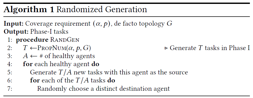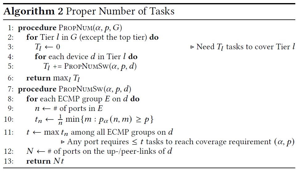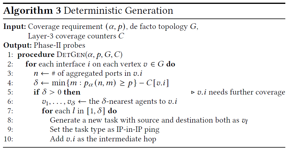 另一个比 Pingmesh 有所提升的地方在于:RD-Probe 加入了后段的 Deterministic Probe 环节,用以确保覆盖率能够达标,而不只是依赖于前期的随机化任务生成。Randomized Probe 与 R-Pingmesh 较为类似:根据覆盖率指标参数 $\alpha$ 和 $p$ 计划出总共所需要的 Probing 组数,而后将指标发派到各个主机上随机生成 Pinglist。但这有可能导致覆盖率不足,因此 RD-Probe 为每个物理主机的每个端口额外增加了一个计数器,如果流经这个端口的 Ping 组数不达标,则额外生成 Deterministic Probe 任务直到满足要求。Deterministic Probe 的思想是:选一个较近的邻居 $v$,构造一个 Src 和 Dst 均为 $v$ 的 Ping 包,把本地端口设为 Intermediate。这两套任务生成相结合,在不大量占用额外流量的前提下,确保了端口级的覆盖率达标。